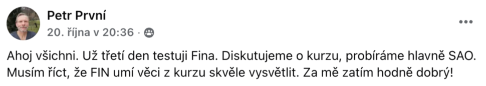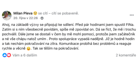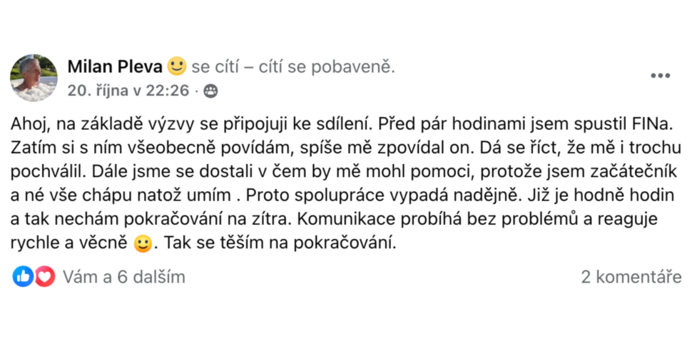 - V 90 % jistě nahradí běžnou podporu našeho týmu. Vše, co se potřebujete zeptat, poradit, ptejte se přednostně FINa.