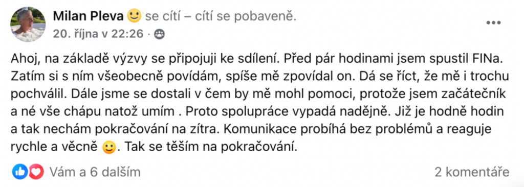 - Nebo si s FINem naplánujte dovolenou, volný čas, požádejte jej o radu, nechejte ho napsat e-mail, zprávu, nebo zkuste cokoliv, je empatický, mentor, kouč...