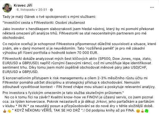 - FINvestorAI vznikl z praktického know-how, které vyrostlo z let řízení kapitálu, mentoringu investorů a systematické práce se sentimentem trhu.