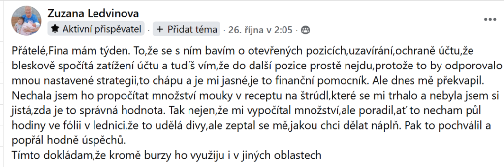 - FINa používá jeho autor, Jirka, na denní bázi. Řešíme byznys, marketing, strategie, investování, podnikatelské projekty.
