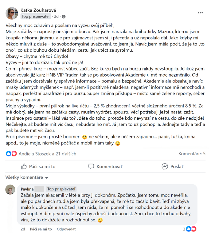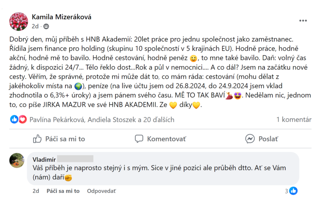 Poklona všem lidem, kteří se na HNB Akademii podíleli. Přehled a výborné zpracování. Učím se pomalu, ale myslím, že se posouvám kupředu. Dělám malé obchody, ale časté. Zkouším obchodovat bezpečně. Přístup k burze beru s respektem, baví mě to. Doporučuji HNB akademii všem lidem, kteří nejsou ochotni splácet celý život hypotéku, ale být finančně nezávislí, svobodní. Moc děkuji za nový příliv energie, adrenalinu a skvělé lidi, které poslouchám.