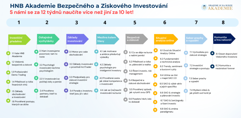 HNB Akademie je vzdělávací program, který učí poctivě krok za krokem základy pro bezpečné a ziskové investování. Struktura a postup se liší od toho, nač jste byli zvyklí v původním kurzu. Obsah zpracovává otázky parťáků, zkušenosti a prověřené postupy posledních let.